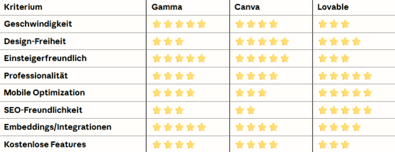 Die drei beliebtesten AI-Website-Builder 2025 – Gamma, Canva und Lovable – unterscheiden sich deutlich in Fokus und Anwendung.